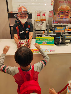 Oke, dari situ lanjut nge-eskrim dulu di A&W. Arsya pintar deh, sudah berani pesan sendiri. Dia minta eskrim sundae mix cokelat dan stroberi 😁